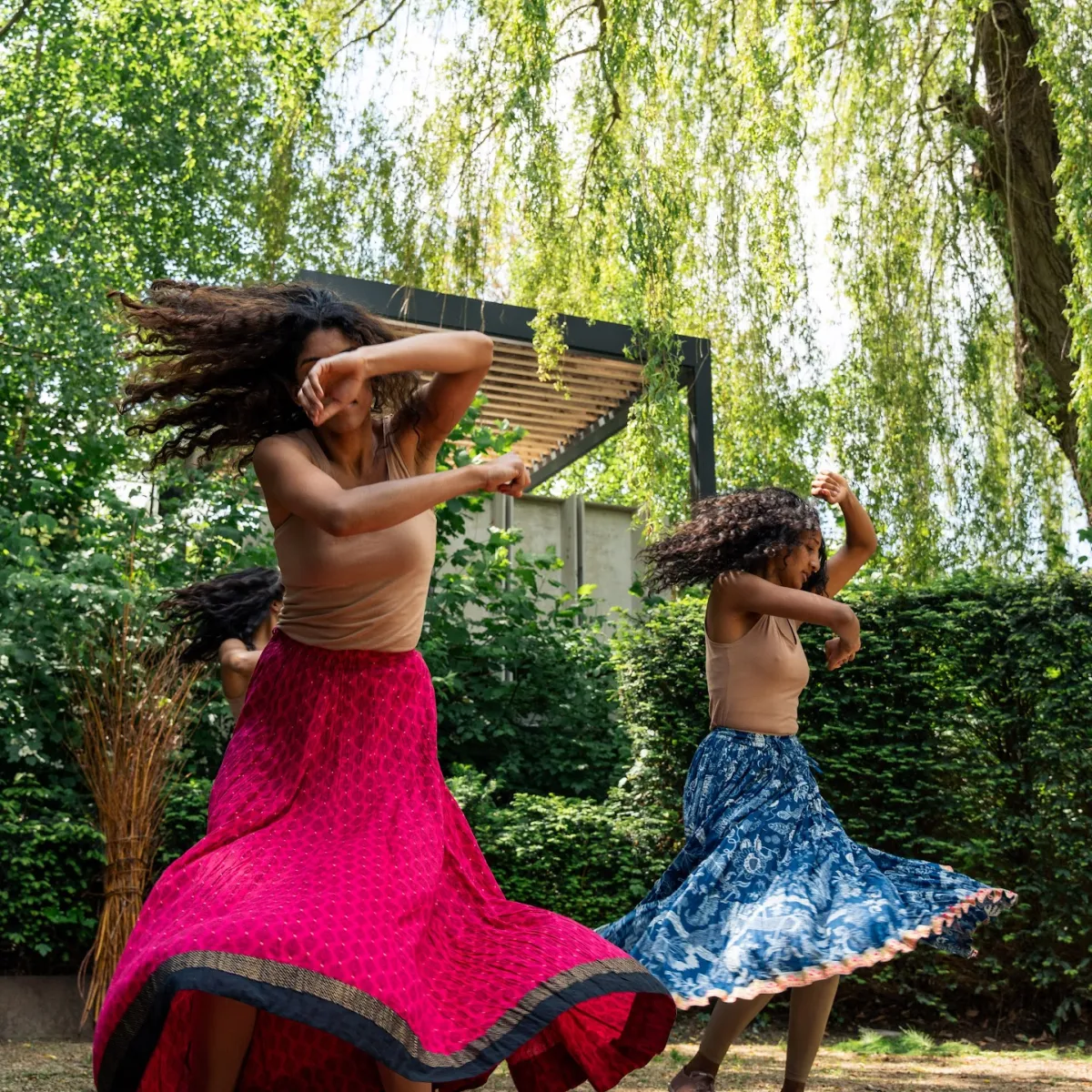 The shape of the space is an homage to the circularity of nature, and the reused tree trunks that form the stage under the willow expose the trees’ rings, symbolising growth and the gradual acquisition of ecological data that trees record.