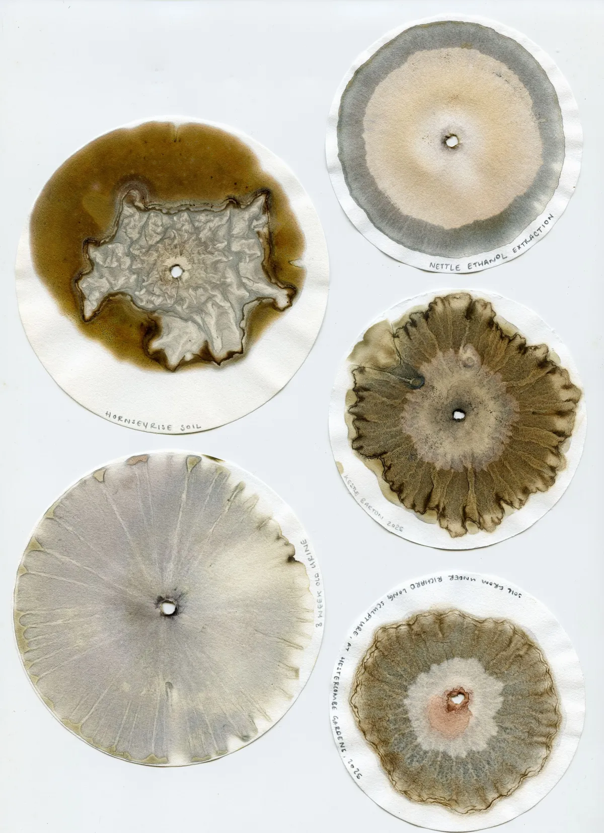 The show also includes a number of chromatograms from Hannah’s archive, these works are visual manifestations of the matter that was use to create them. Over the course of the exhibition, Hannah will be making site specific chromatograms at OmVed, revealing the microbial activity, vitality and energy present in different sample of soil across the site. These works allow us to consider the unseen energies and memories held and inscribed within material beings.
