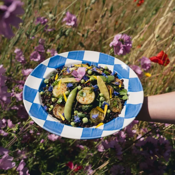 Puy Lentil Salad with Courgette, Mangetout, and Basil Chimichurri by Josephine Marchandise, Head of OmVed Gardens Kitchen